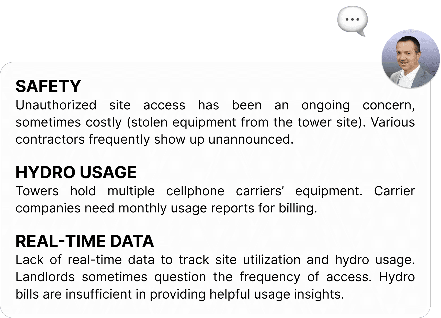 It’s a frustrating process every month to calculate the hydro breakdown of each cell tower, not to mention the safety concerns over unauthorized site access. We need a way to track the utilities and the access to our cell tower sites.”